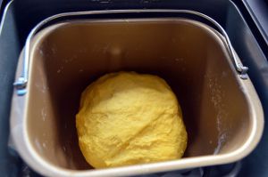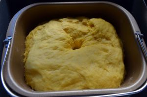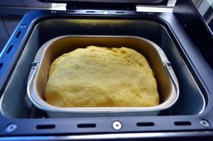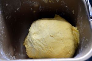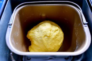 把面团取出稍微滚成圆球形,放回面包桶里盖上盖子,启动菜单发酵进行首次发酵。