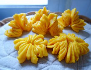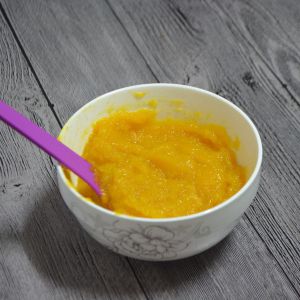 把蒸熟的南瓜泥 用勺子捣成泥,放凉待用。