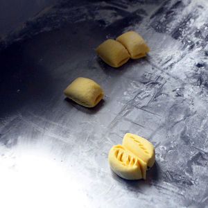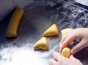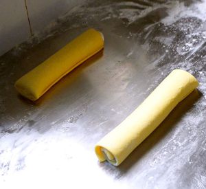 将醒好的面团揉匀、排气,揉至面团切面无蜂窝孔,再将两种颜色的面团分别分成14或15等份,揉圆