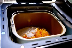 先放液体后放粉类的顺序,清水-白砂糖-中筋面粉A-熟南瓜泥-酵母按顺序倒入面包机桶里。