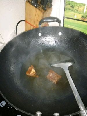 红糖块两块放锅里加水煮化,水的量大概是两碗水,不要多,一会挪面粉要用的水就是红糖水