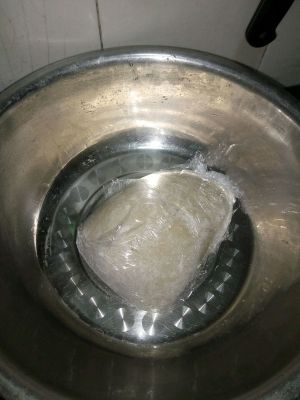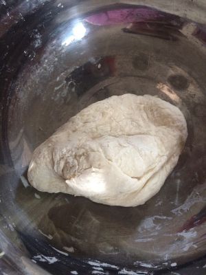 盆里放入面粉跟泡好的酵母粉,太干了可以在加点水,揉团,放着发酵二十分钟,发酵时用个干净的布盖着,