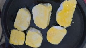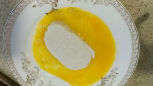 取一片放入蛋液中,两面均匀沾上蛋液。