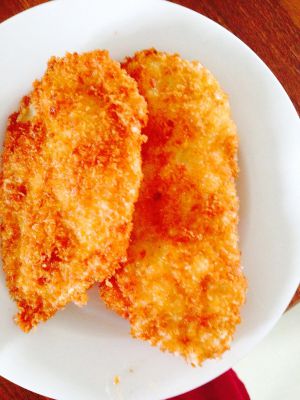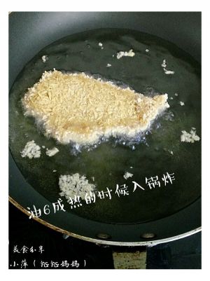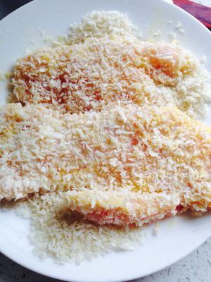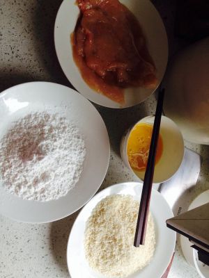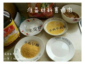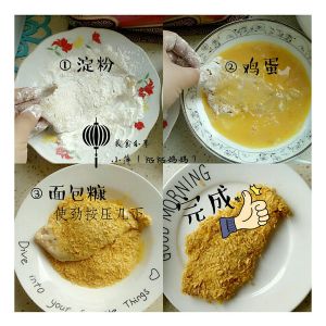 看图,步骤顺序全部标记。 (注意裹淀粉时候,记得用手轻轻按摩几下,裹面包糠的时候使劲按压几下,为了炸的时候不掉面包糠)
