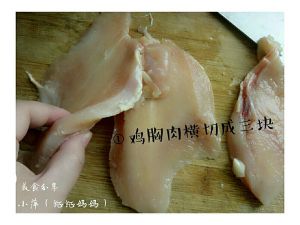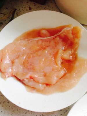 鸡胸肉片薄片。我片了4张。用刀背敲松。加盐料酒腌制20分钟