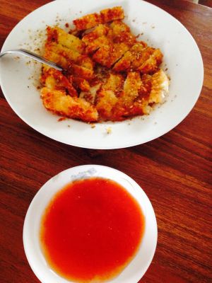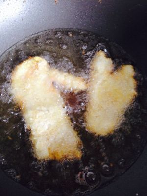 炸好后夹出,切成块,撒上辣椒粉或是淋上番茄酱即可