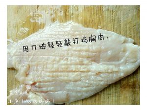 用刀轻轻敲打鸡胸肉,为了让腌料更好入味