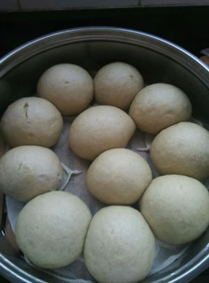 看着生坯明显变大,轻盈了,打火,大火烧开转中大火蒸十八分钟关火,焖五分钟掀盖取出(天冷锅内外温差大,可先用筷子支个缝跑跑气再掀盖,防止包子遇冷收缩。天热不需支筷子。