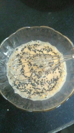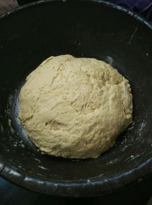 将面粉一碗,玉米粉,红薯粉,小米粉,荞麦粉共一碗倒入盆中,再加入两颗鸡蛋,一小勺发酵粉(喜欢较甜口味的可加入适量白糖,因为妈妈血糖高,所以今天做得是无糖的)。边搅拌边加入牛奶,直到面团光滑。