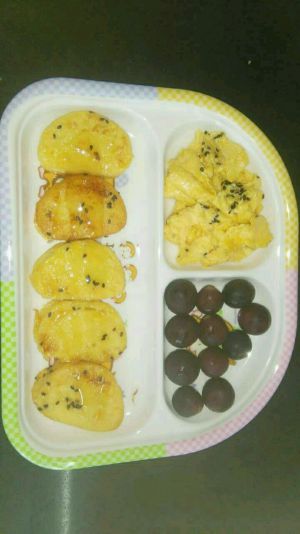出锅装盘,淋上蜂蜜。摆上一些水果,加上一盒儿童牛奶,美美的早餐就完成啦!
