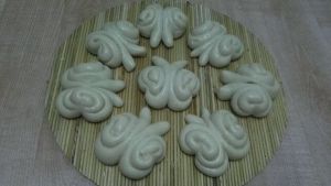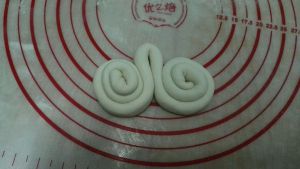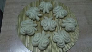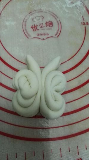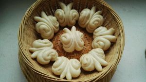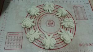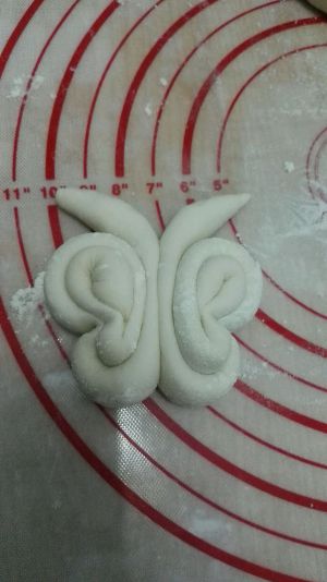 蒸锅添温水,把蝴蝶馒头放上铺了玉米皮(也可用棉馏布、油纸等垫底防粘)的蒸架上,盖盖醒十五分钟左右。)
