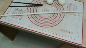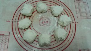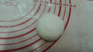放揉面垫或案板上用擀面杖擀开排气,(或用拳头捣, 用掌跟揉、折叠,并重复此动作对面团进行排气),直到把面团揉光滑(分次撒少许干粉防粘)。