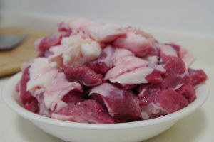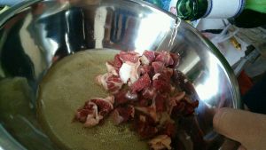 牛腩切小方块,加少量盐和啤酒腌制10分钟。(啤酒腌肉可以让肉不柴哦。)