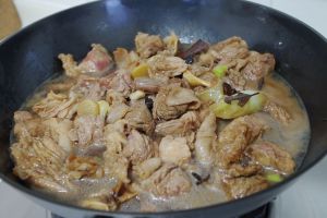 倒入适量清水,水量大约没过牛肉2/3即可。 这时尝一下汤的味道,如果之前的盐量不够,可以这时再增加,汤的味道比平时吃的菜味道略咸一点为宜。