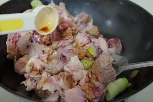 待大部分牛腩块略微发白时,依次加入生抽和老抽,略微翻炒,待调料均匀裹于每块肉上。