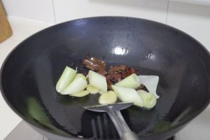 再加入切成段的大葱及姜片进行翻炒,待炒出香味后,倒入牛腩块,进和翻炒。