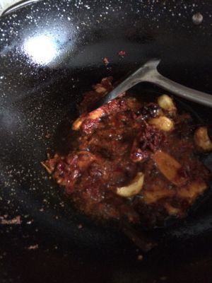 锅里爆香香料、小米辣,豆瓣酱、葱白、生姜。