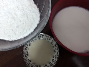 糖,玉米面粉,普通面粉放在一起,拌匀