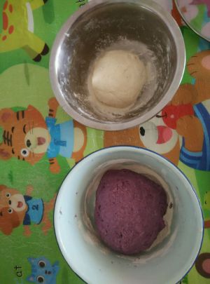 紫薯捣成泥与面粉发酵粉和成紫色面团。面粉和发酵粉和成白色面团。