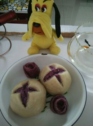 发酵完成后,用紫色面团滚成小圆团做馅,白色面团擀成片做皮,包在一起后在馒头顶上用刀划十字,十字一定要深一点