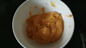 清水70克倒进面包机桶,再放入红薯泥,最后放入300克面粉