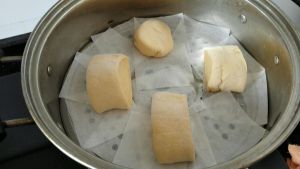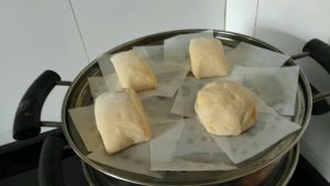 蒸锅的蒸格上已经事先垫好了油纸(以前买了好多这种一寸见方的油纸,要慢慢用完),没有油纸的话可以用纱布或者蒸格上抹上一些油防止馒头粘锅