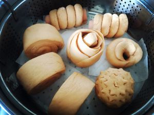 把创意品全部摆在锅里继续醒15分钟,开火,上汽儿后蒸15分钟,关火,为了保持美丽的造型,需要等5分钟以上再揭盖哦!完成!