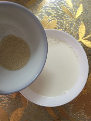 把牛奶放入奶锅里稍煮热一下,不用煮沸,大概30度左右,但我没有用温度计,我只是用手感温,因为牛奶热会把酵母好溶化!