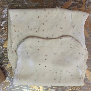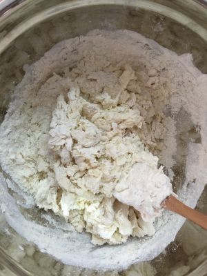 然后将牛奶酵母液放入粉中,拿个勺子搅切碎状