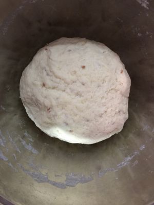 醒发好面呈蜂窝状,揉上一点碱面(我醒发了两天两晚上,想做老面的)揉好后分出一块来,放玉米黑豆面和适量小苏打,适量水,混合揉在一起在醒发五分钟左右就蒸