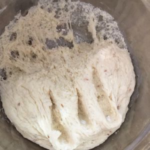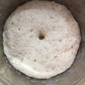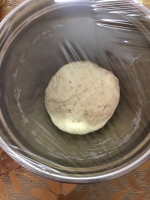 盖上保鲜膜放在室温里发至2倍大(时间大概1小时)因为我们这边天然了,如果天冷要放入发酵机里发酵