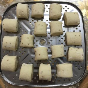 然后锅里烧开水后关火,等2分钟,然后放这馒头胚放入锅里,盖上盖子15分钟2次发酵
