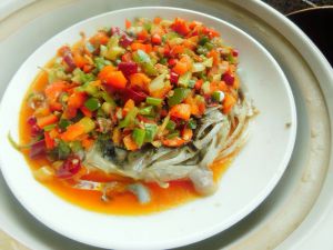 在炒锅中放一勺油加热的同时,在蒸熟的鱼上放入红、黄剁椒各一勺,并放上姜丝和葱丝,倒上适量的蒸鱼豉油,然后将烧烫的油浇在鱼头上,剁椒鱼头就算大功告成了,开吃!