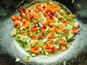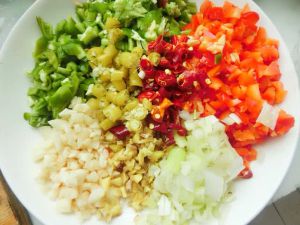锅中烧油,油熟时转中火一次倒入姜蒜青椒红椒小米辣泡椒葱爆炒。