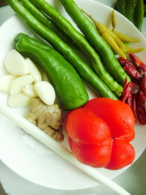 准备材料,如图所示。红椒、尖椒、干红椒、小米辣、姜、蒜、葱、泡椒(图片上没有放小米辣,实际有哦,辣椒数量根据个人口味)