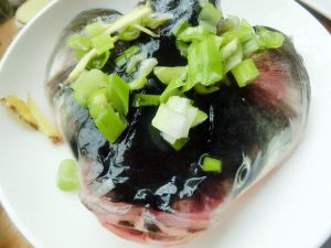朝天椒跟剩下的姜剁碎均匀撒在蒸好的鱼头,淋上少许的蒸鱼鼓油,在入锅蒸10分钟。