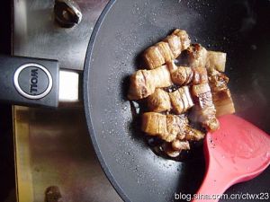将煎出的油倒出,只留下五花肉。 大火,加适量酱油翻炒上色,如果用生抽老抽颜色会更好些,但味道可能没有酱油来的好。