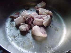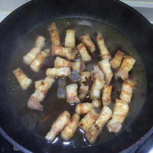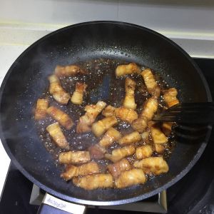 锅中热油,放入糖。炒出糖色将肉倒入锅中,炒至双面焦黄(为了防止油溅到身上,可以关火放肉,炒几下再开火)。