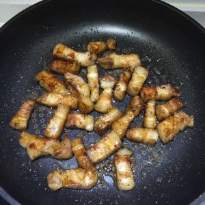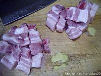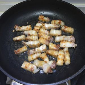 五花肉切成长方块,我喜欢切得小一些。 因为给老人和孩子吃,牙口不是很好,所以去了肉皮。 用平底不粘锅小火煎至金黄。 不放油!不放油!小火!小火!慢慢煎。