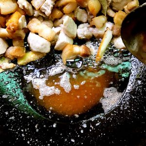 加入3汤匙生抽、2汤匙老抽、1汤匙雕酒翻炒