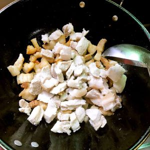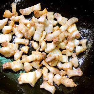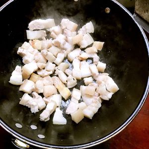 热锅小火,把焯过水的五花肉较肥的先挑出,放进炒锅里干煸出油