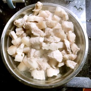 五花肉洗净清水浸泡2小时后切小块(2厘米见方),冷水下锅,加一汤匙雕酒,水滚后撇去浮沫