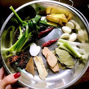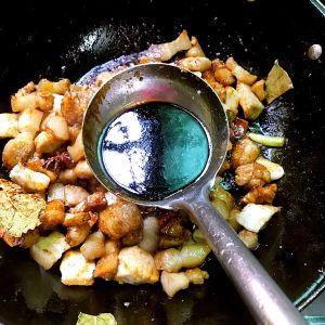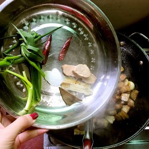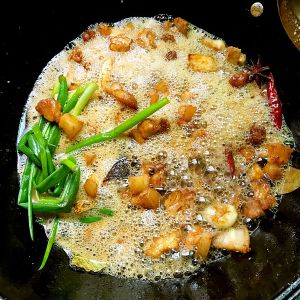 锅内加少许油煸炒,加葱姜蒜,花椒数粒,八角一个红辣椒干一个