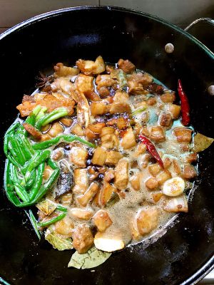 炒锅入油下五花肉煸炒,炒至出油焦黄,加葱姜,花椒,大料,干辣椒爆香,烹入料酒,加入老抽,冰糖。再倒入煮肉的汤没过肉,大火烧开,小火慢炖,至汤收干即可。