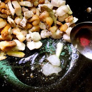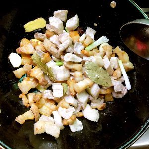 洗干净锅,倒入花生油一点(看看五花肉的肥肉多少,肥肉多就少倒些)。把沥好的五花肉倒进锅内翻炒。防止粘锅,直到出油后五花肉变色后。放入姜片,蒜瓣,葱继续翻炒等到姜片,葱,蒜瓣的味道出来。把肉盛出来备用。