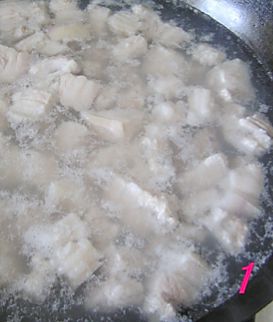五花肉切成3厘米方块。水开后滤血水。(放入生姜 花椒 葱结)