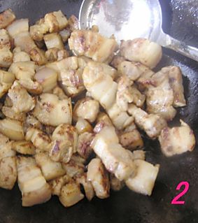 锅内放少许油少许清水,放入白糖炒出糖色后,加入焯好的肉块翻炒,上色后继续小火翻炒,直至肉块缩小,锅内油增加,说明肉块里的油已被逼出,捞出控油。