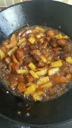 把土豆切成小块,香菇切片备用。起锅烧油,放入葱花爆香,放入土豆煸炒,待土豆颜色变透时,放入香菇翻炒一阵,把已做好的红烧肉倒入。