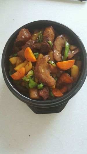 把刚炒好的菜放在石锅里,放在炉子上,当听到吱吱声就可以把火调小,再等三分钟。焦香的米饭,浓郁的红烧肉,就着烫烫的汤汁......开吃喽