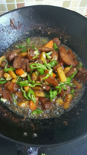 倒水刚刚没过菜炖煮,等到水分收干,放入辣椒和胡萝卜继续翻炒后(这样用油炒的辣椒和胡萝卜有香味,如果有水的话,那样是用水炖出来的菜就没有香味了)再少加一些水,等汤变浓就可以了。